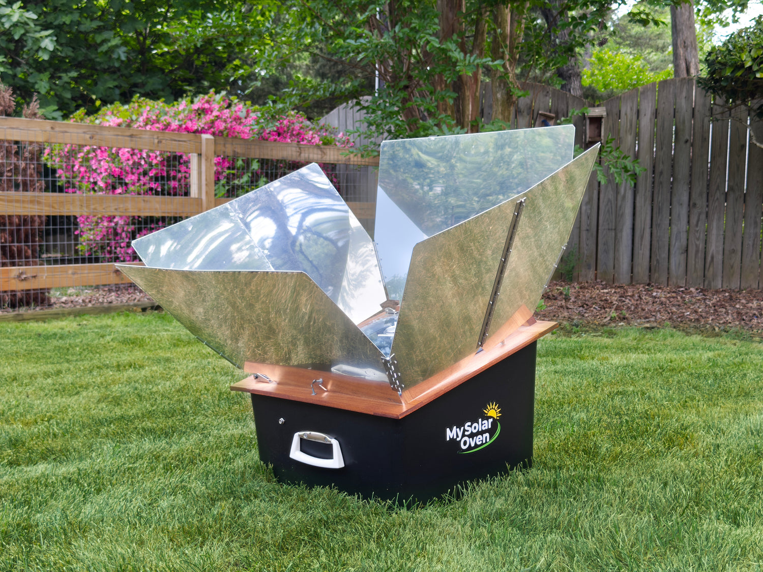 My Solar Oven harnesses the greenhouse effect to reach true oven temperatures using only sunlight. No fuel, no electricity, no emissions. Built tough in the USA with a black anodized aluminum cooking chamber, extra-clear glass door, and heavy-duty reflectors, it works with any oven-safe cookware. Just point it at the sun, preheat for 15 to 30 minutes, and cook.